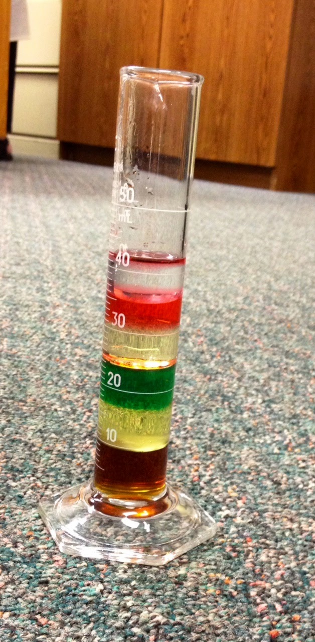 The second set of experiments demonstrated the relative densities of substances.  We made a rainbow with liquids of different densities.